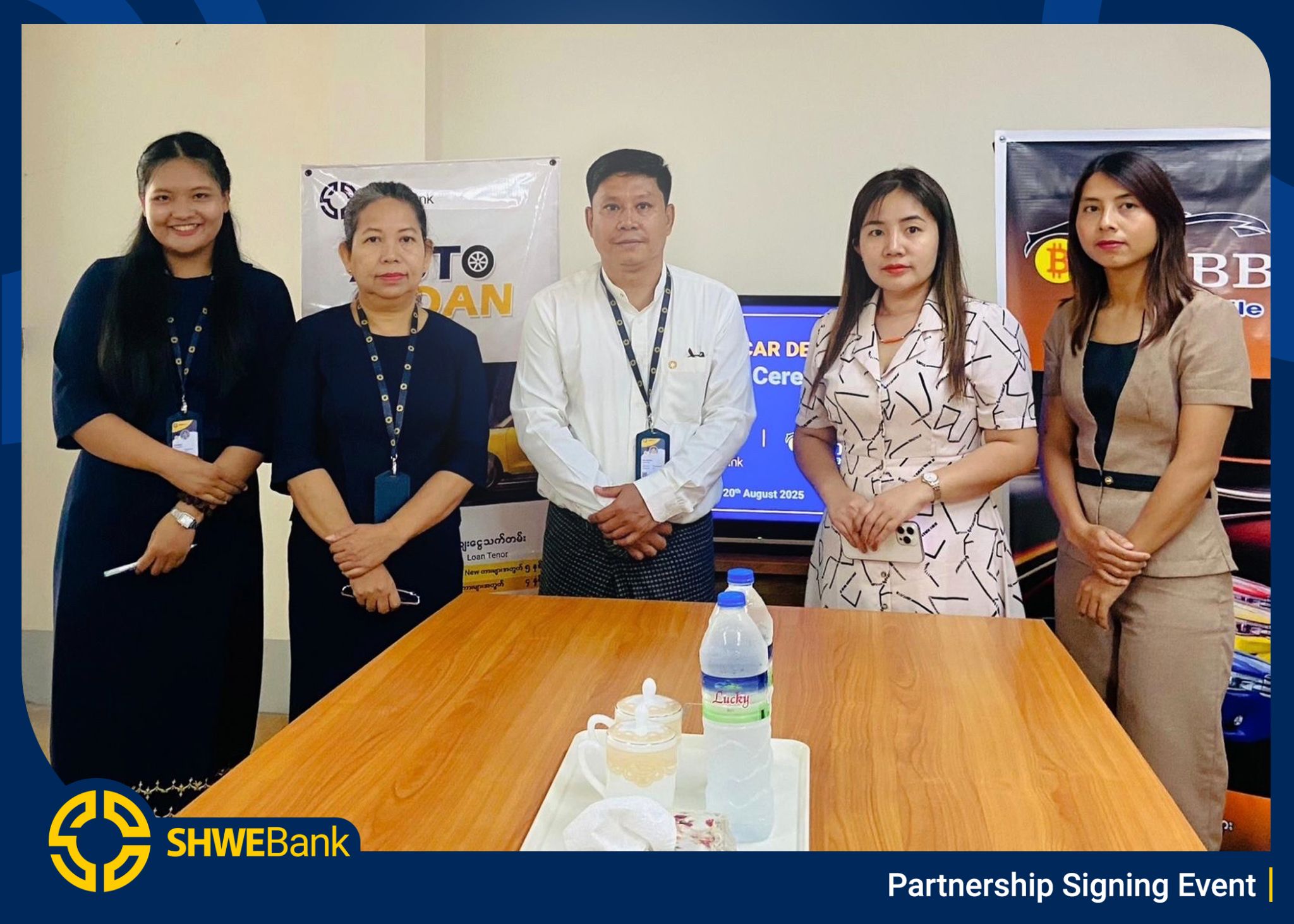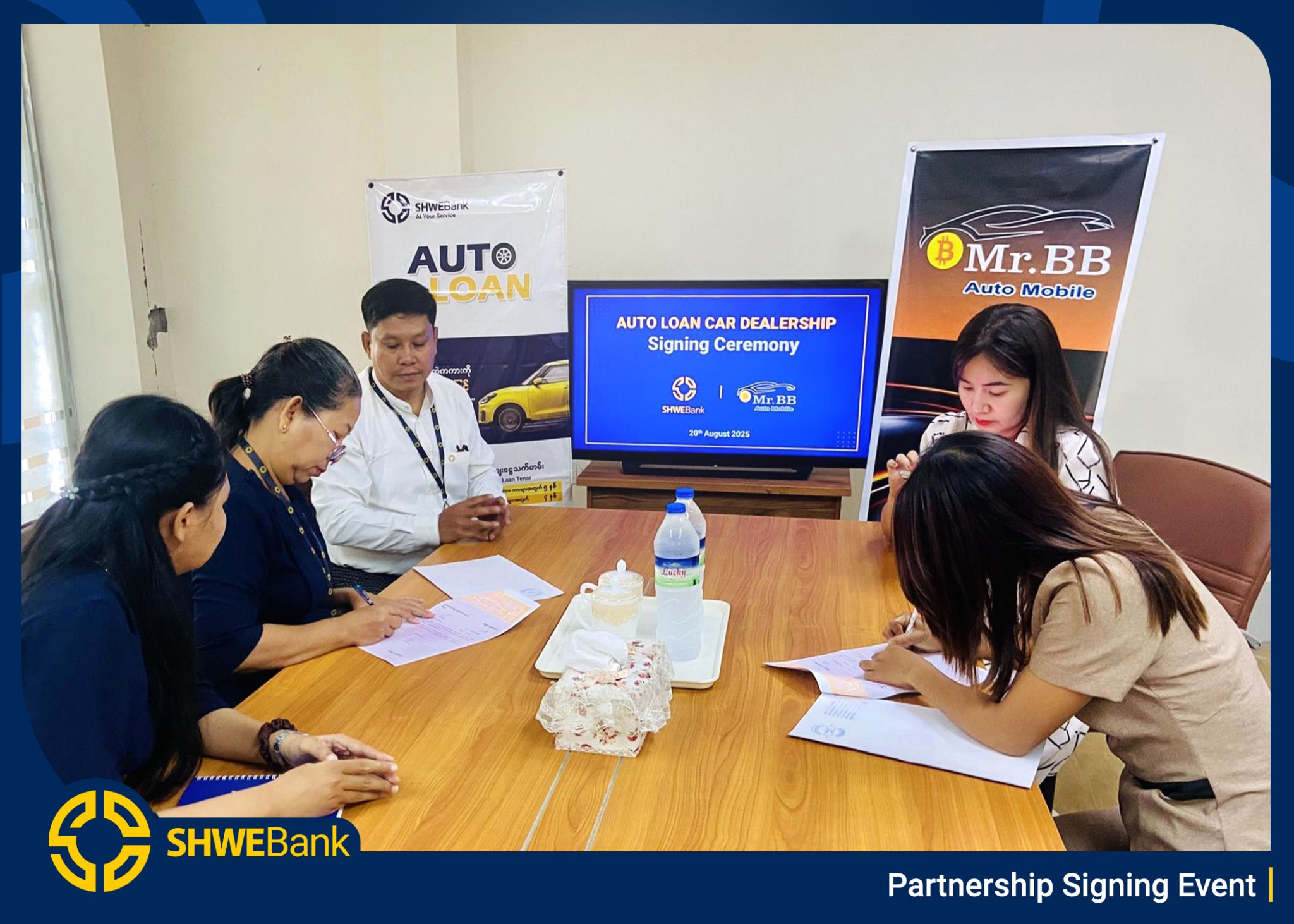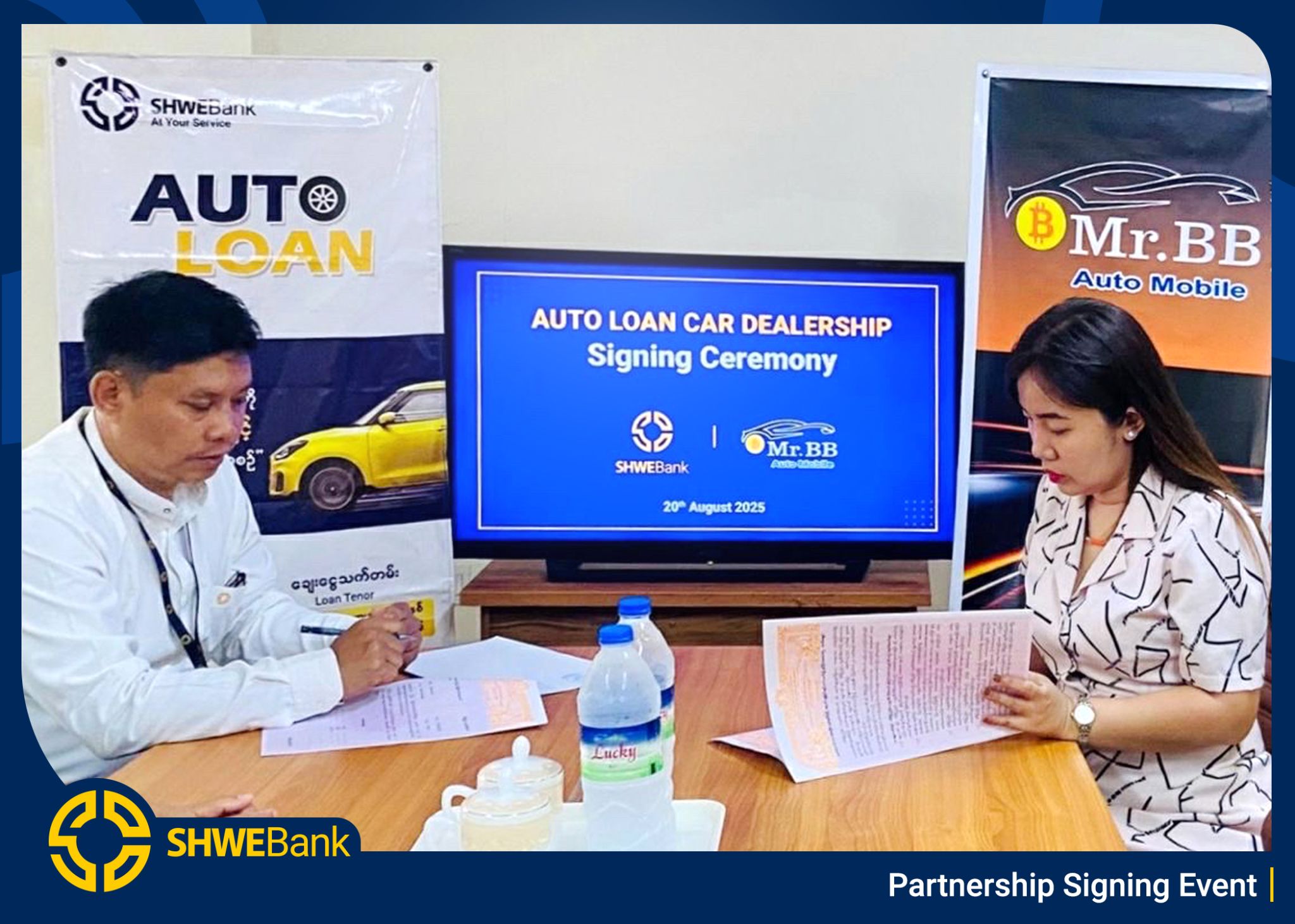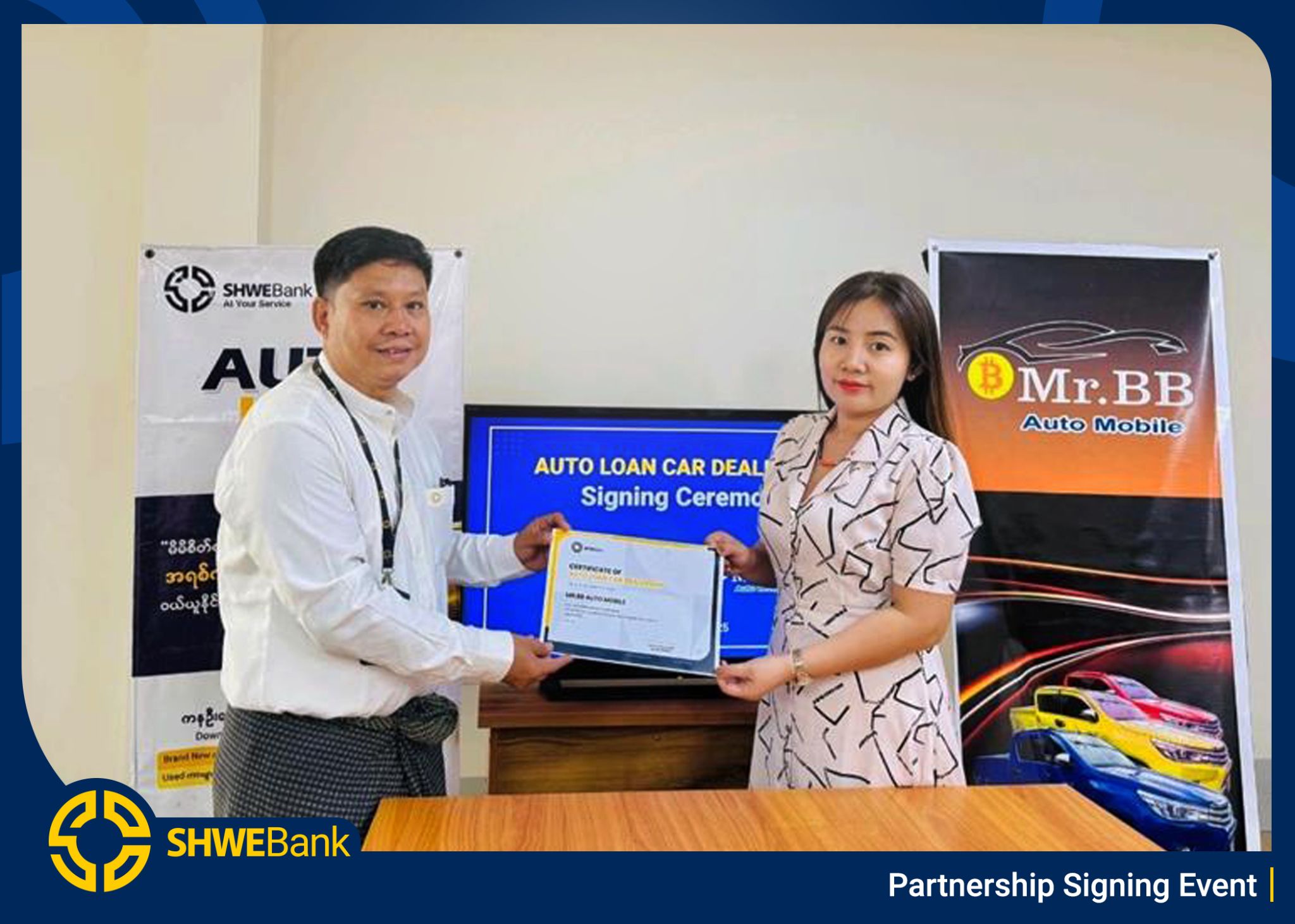 SHWE Bank and Mr.BB Auto Mobile have officially signed a Car Loan Dealership agreement to make your dream a reality. From now on, you can purchase a car from Mr.BB Auto Mobile through SHWE Bank’s Car Loan system and conveniently pay in installments. No more waiting for years—this partnership makes it possible to own your dream car in a short time with ease and flexibility.